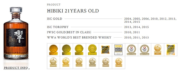 Rượu Hibiki 21 năm là một trong những thương hiệu đoạt khá nhiều giải thưởng tại các cuộc thi rượu quốc tế hàng năm.